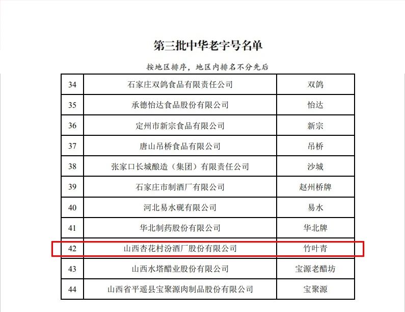 为贯彻党中央、国务院决策部署,落实中央经济工作会议精神,推动老字号守正创新发展,2月1日,商务部、文化和旅游部、市场监管总局、国家知识产权局、国家文物局五部委发布《商务部等5部门关于公布第三批中华老字号名单的通知》,山西杏花村汾酒厂股份有限公司“竹叶青”品牌荣获“中华老字号”称号。
